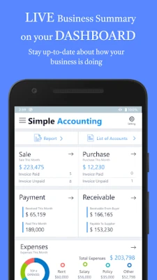 Simple Accounting Bookkeeping has been designed for small businesses to manage their complete accounting needs with limited or no knowledge of underlying accounting principles. You can send across invoices, record purchases, manage your expenses, track your payable and receivables. App is free to try for 30 days, after which you can purchase subscription for unlimited transactions